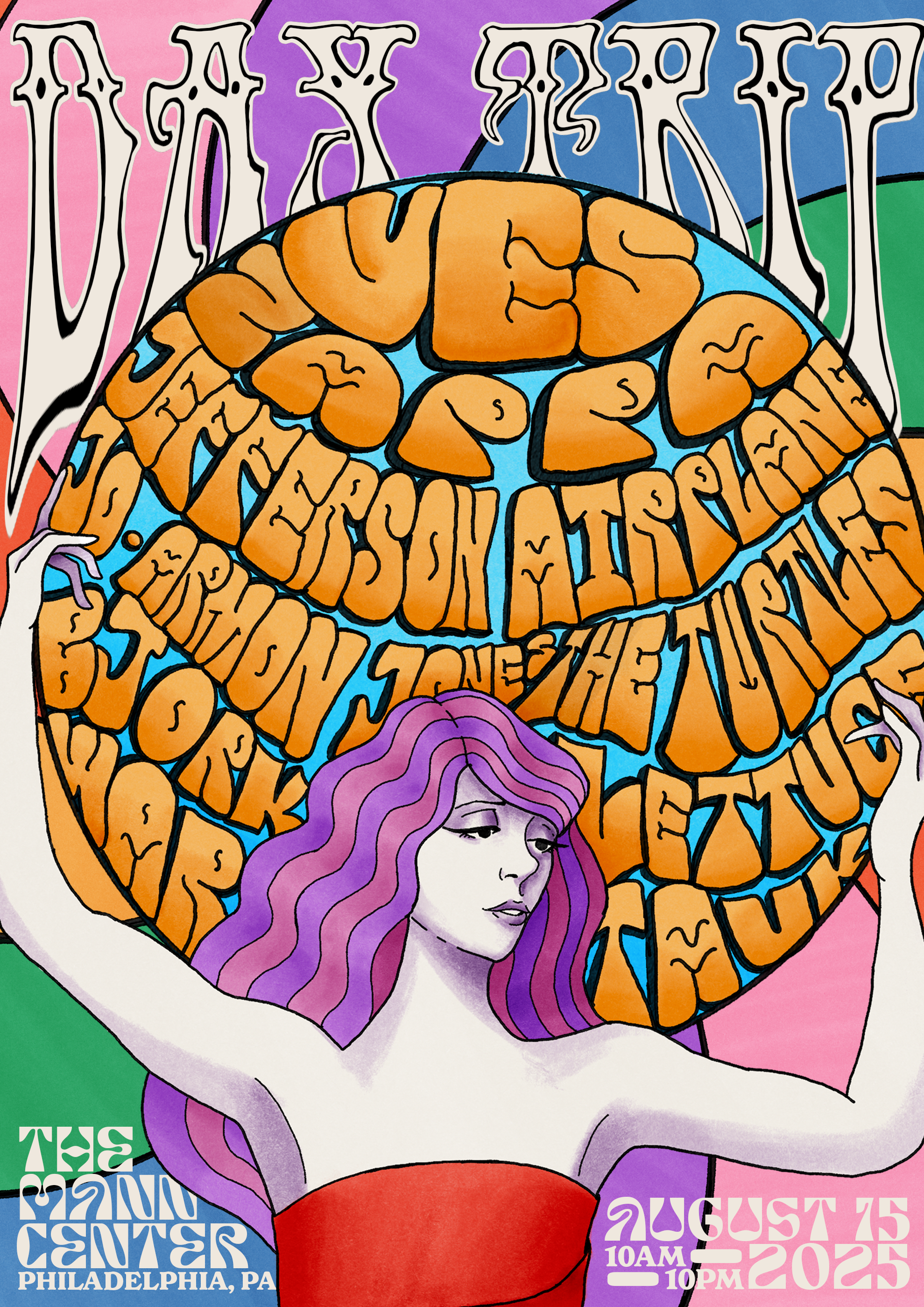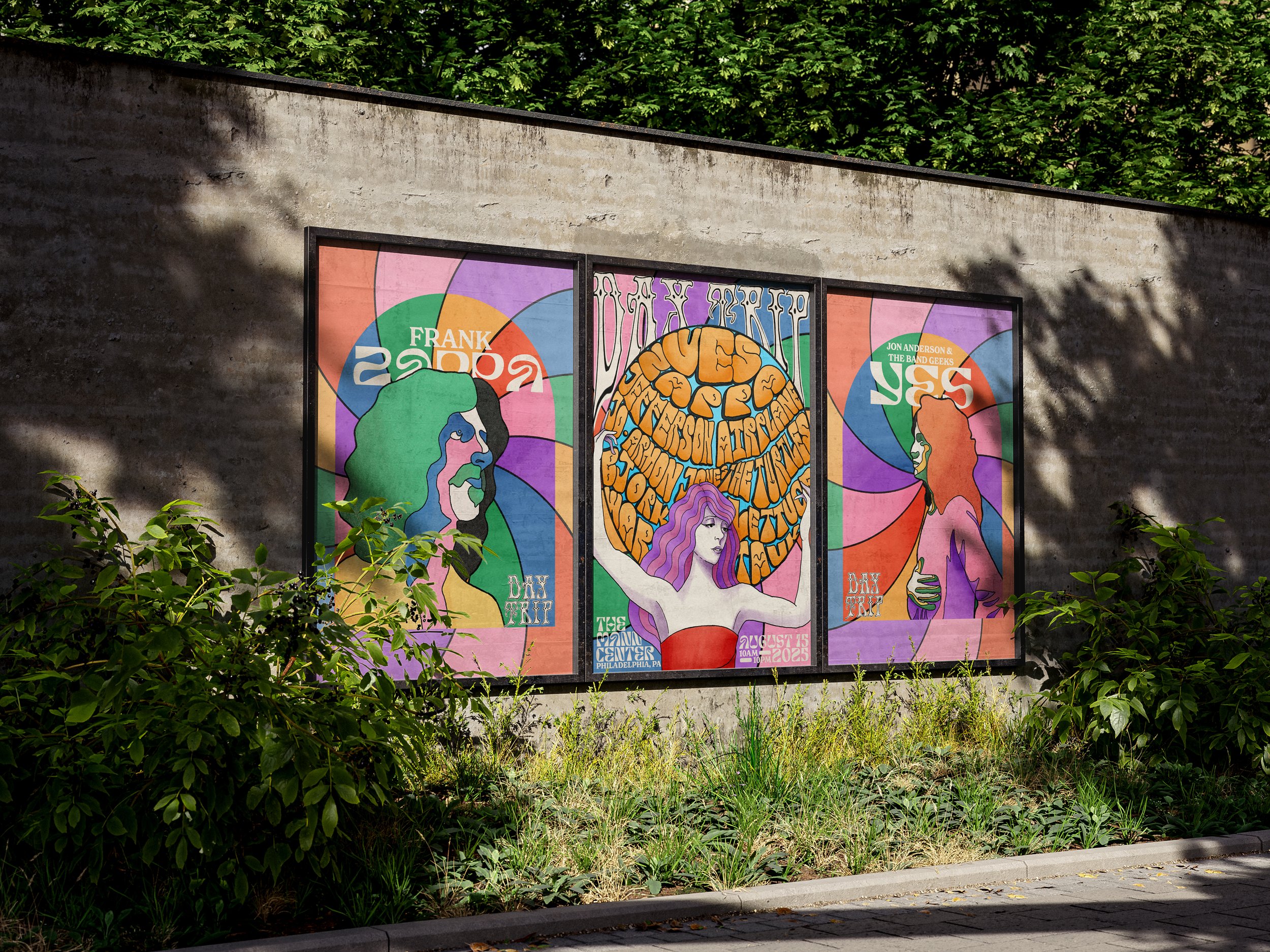 Brand identity for a conceptual music festival rooted in 1960s psychedelia. The design pulls from that era's visual language, flowing typography and illustrative motifs applied across posters, merch, and wristbands to create a cohesive festival experience.